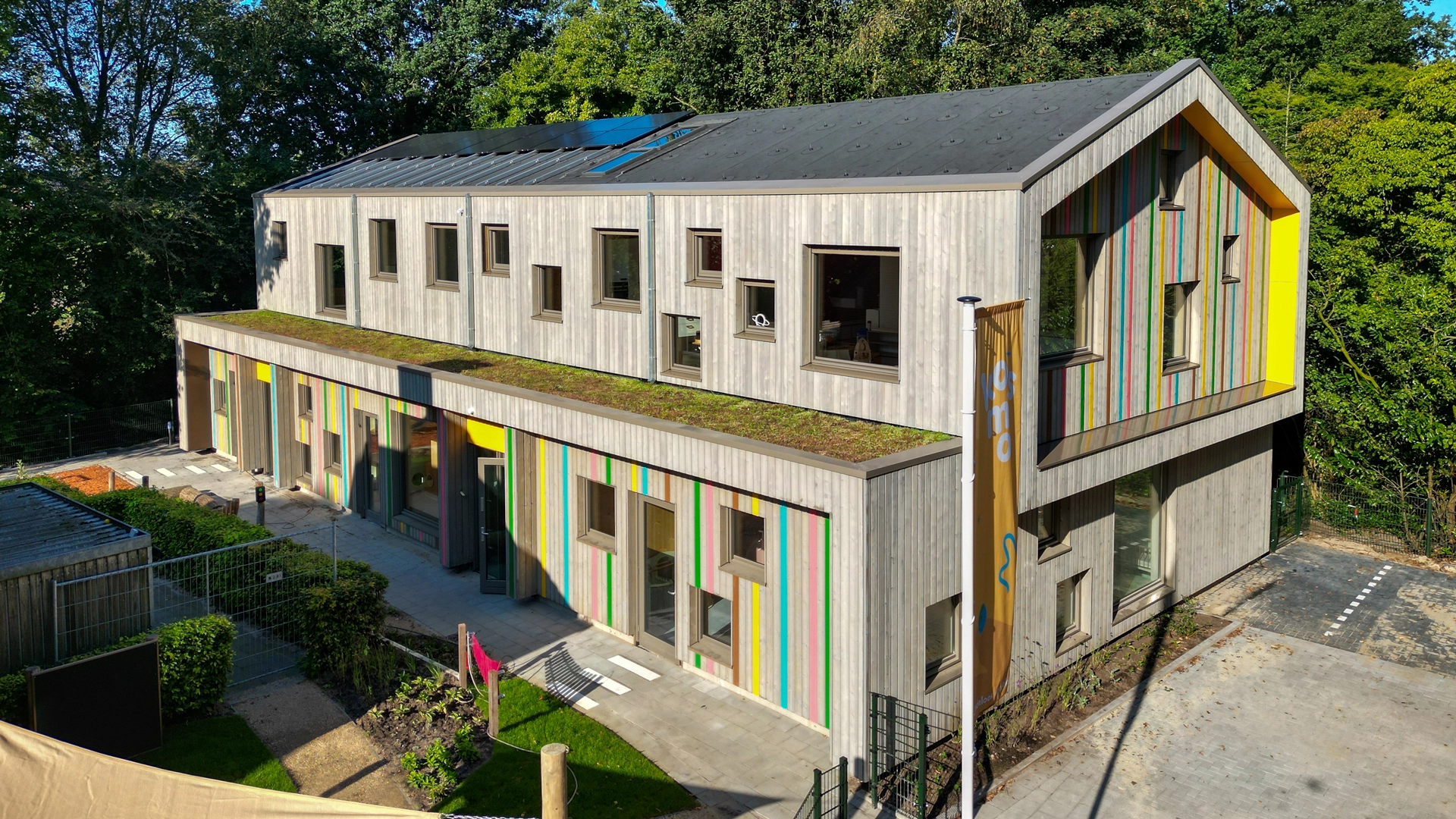 In het interieur zijn veel houten wanden in het zicht gelaten, wat niet alleen bijdraagt aan de warme, natuurlijke uitstraling, maar ook een tastbare connectie met de natuur creëert. De gevel, met zijn kenmerkende vrolijke uitstraling die past bij de KOSMO-identiteit, zorgt voor een welkomende entree die kinderen en ouders direct omarmt.